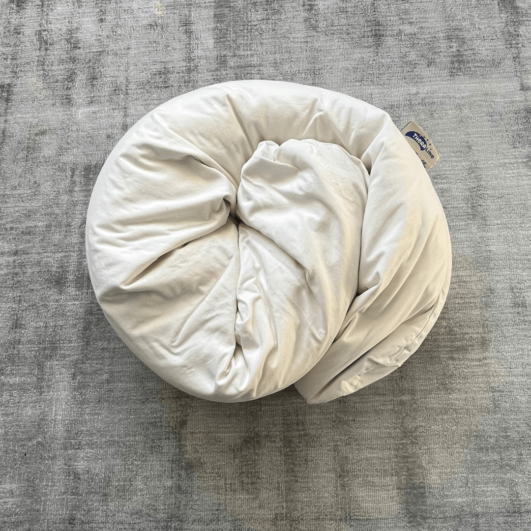 Das Stillkissen wird vor dem Beziehen zu einer engen Schnecke gerollt und in den Bezug gelegt. Durch den flexiblen Kordelzug wird der Bezug mit einem einfachen Knoten verschlossen. Handelsübliche, große Stillschlangen passen sich der Form des Bezuges an.